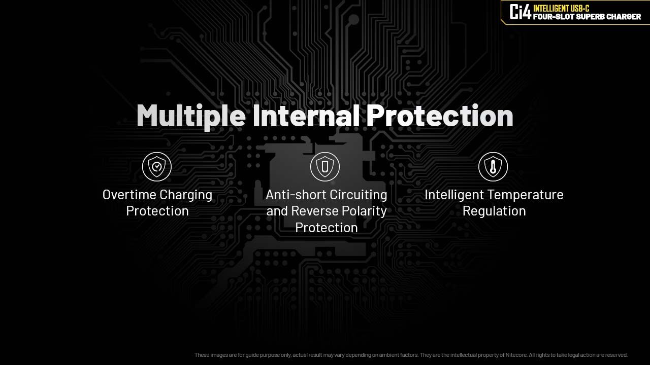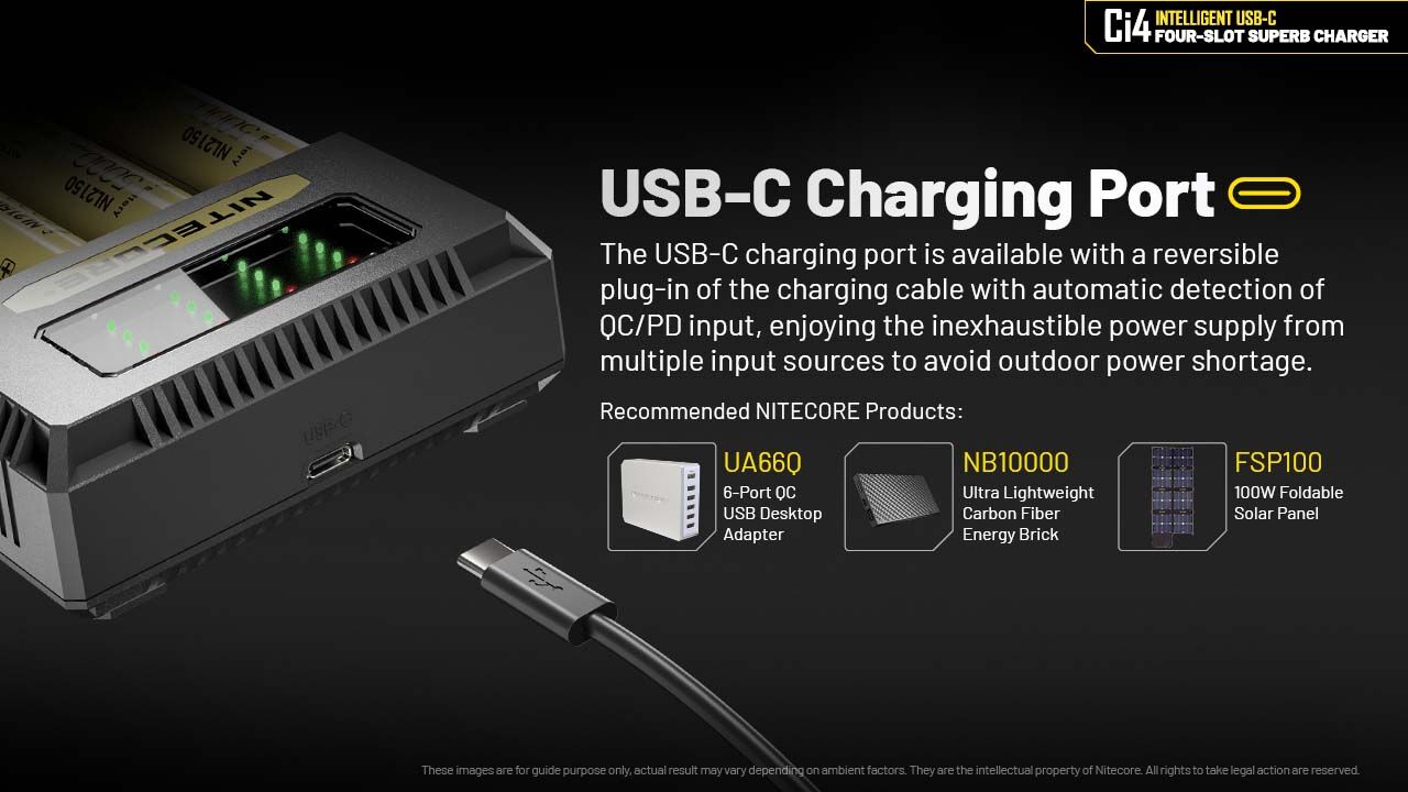 The Ci4 is a QC/PD input available intelligent USB-C four-slot superb charger with a single slot max output of 3000mA while it is equipped with a USB-C charging port for outdoor charging, compatible with Li-ion and Ni-MH/Ni-Cd batteries.