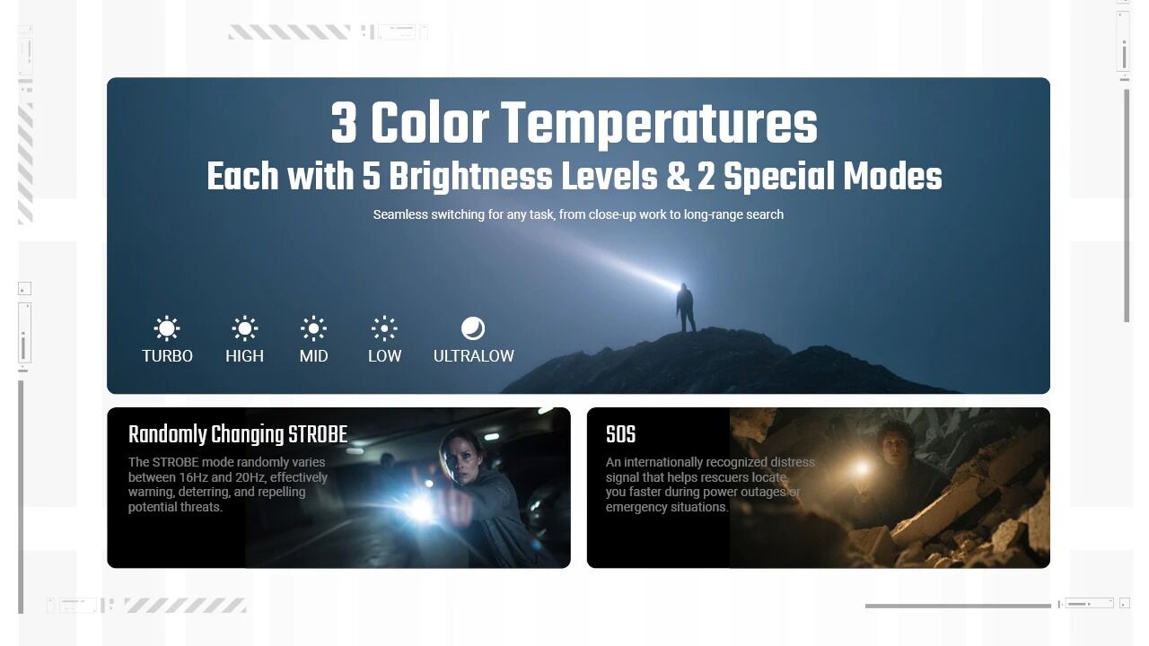 • Offers 5 brightness levels, STROBE and SOS for each color temperature