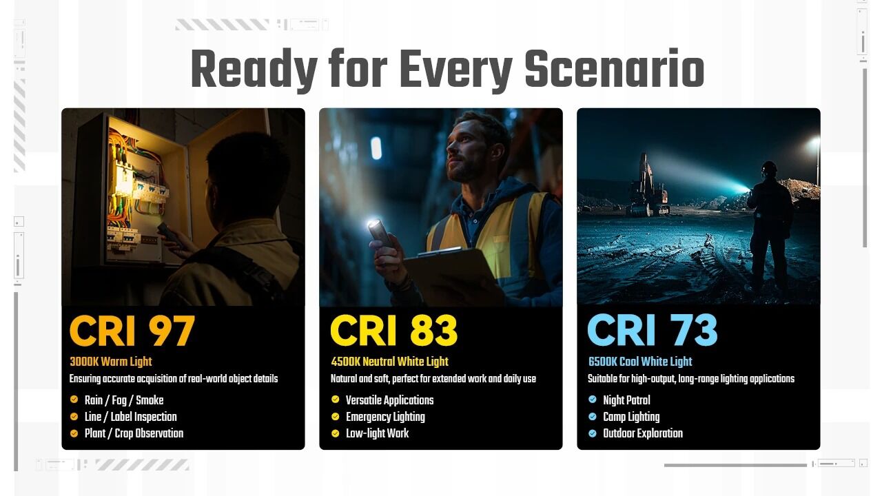 A triple color temperature system lets you choose the right light for the situation. Cool white provides crisp visibility for outdoor walks and longer distances, neutral white offers balanced illumination for everyday tasks around the house, and warm high-CRI light is easier on the eyes for nighttime use and close-up work. From quick chores to evening strolls, EDC07 adapts effortlessly to real-world scenarios.