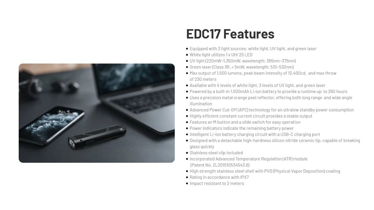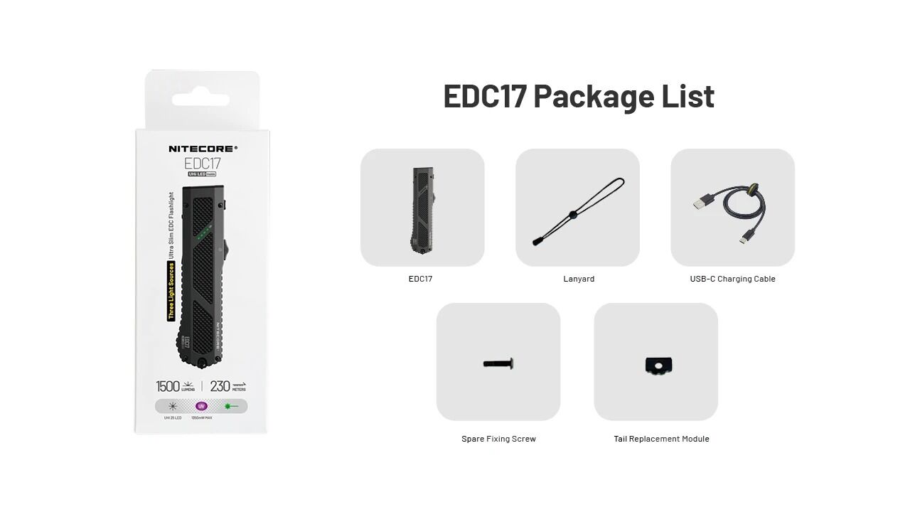 The EDC17 consolidates what would normally require carrying three separate tools: a high-output flashlight, professional UV light, and precision laser pointer. One device, one charging cable, one thing to grab.