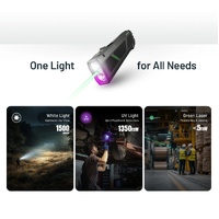 Three professional tools in one pocket: 1,500-lumen flashlight, UV authentication light, and precision green laser. Stainless steel construction with USB-C charging.