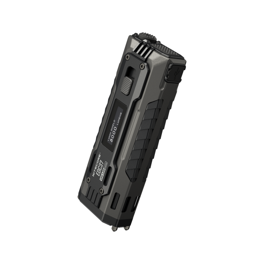 The NITECORE EDC37 Ultimate Tactical EDC Flashlight utilizes 2 x UHi 20 MAX LEDs, featuring 8,000 lumens, 8,000mAh large capacity, and 420 meters long range. It is designed with a dual-stage customizable button to customize the function for instant response and a delicate and durable construction with unique armor-style texture.