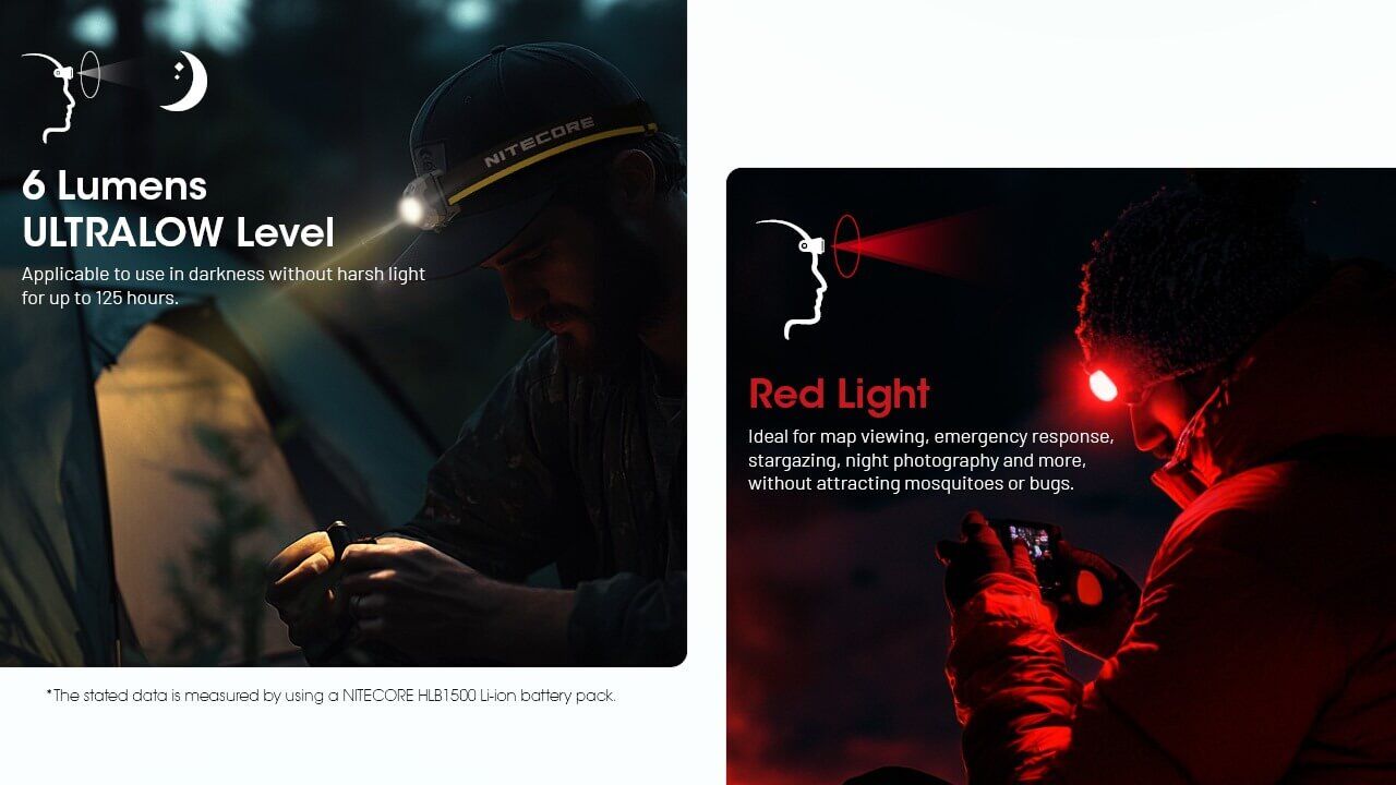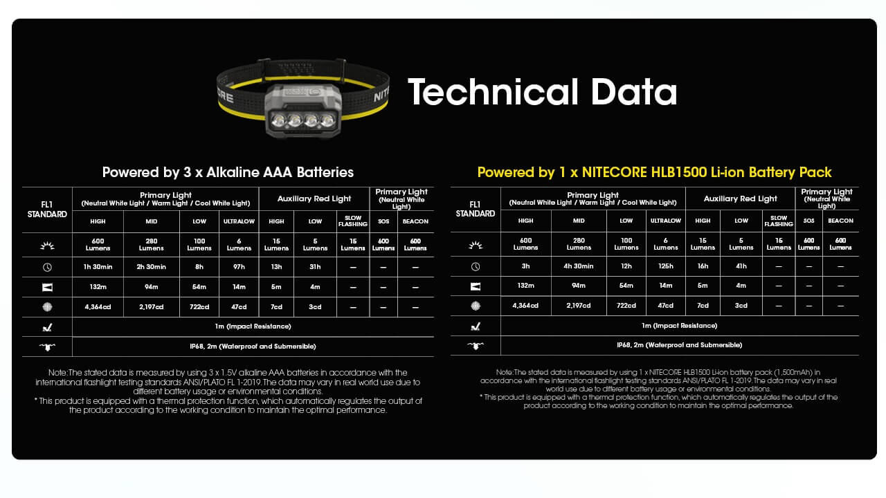 Note: The max runtime is measured by using a NITECORE HLB1500 Li-ion battery pack.