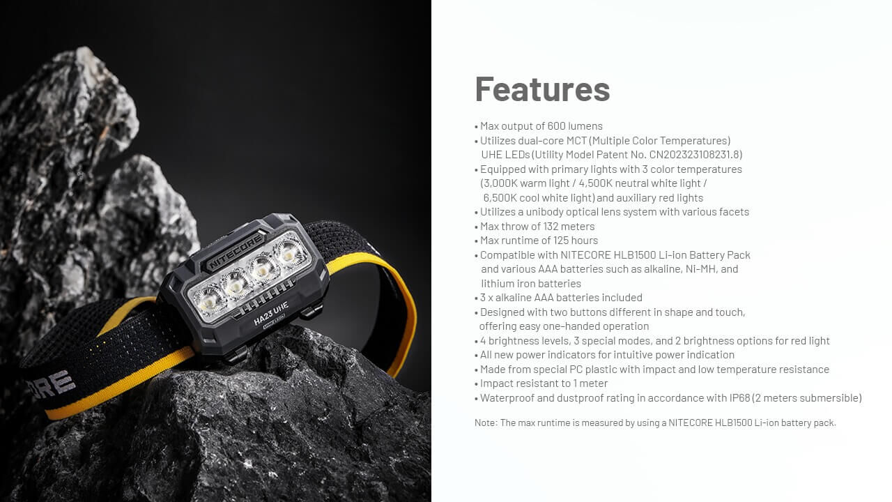 - Compatible with NITECORE HLB1500 Li-ion Battery Pack and various AAA batteries such as alkaline, Ni-MH, and lithium iron batteries