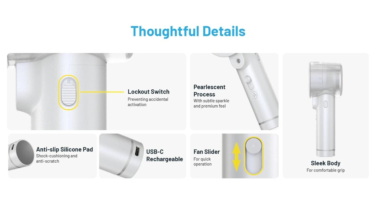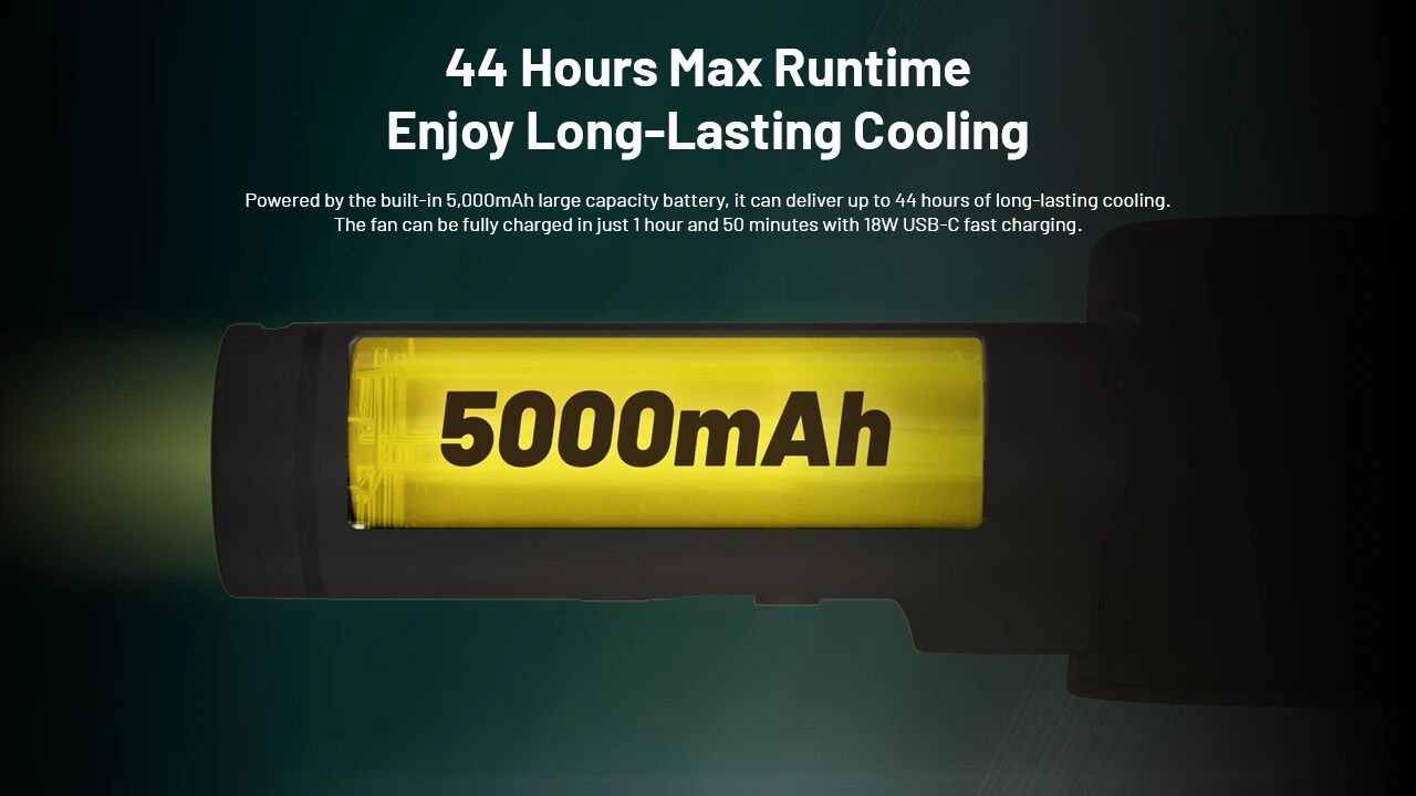 Equipped with a 5,000mAh rechargeable Li-ion battery, this fan lasts up to 44 hours on low settings. With USB-C PD/QC fast charging (up to 18W), it recharges in just 1h 50min, ensuring you’re ready to go quickly.
