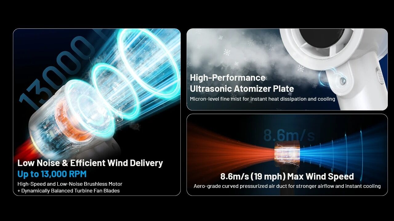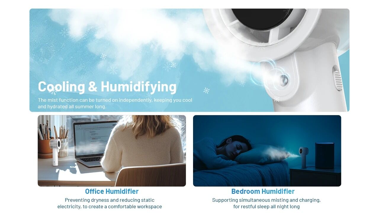 Activate Fan Mode, Mist Mode, or combine them in Cool Mist Mode for instant cooling and hydration in dry climates. The mist function outputs 72mL/h, providing relief during camping, sports, or long workdays.