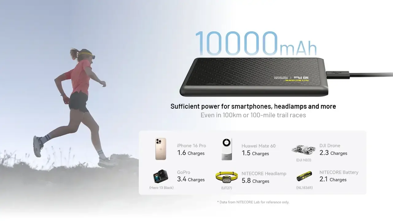 Equipped with a 10,000mAh Li-ion battery (38.5Wh), the NB Plus balances power and portability. At only 155g, it slips easily into your pack without weighing you down.