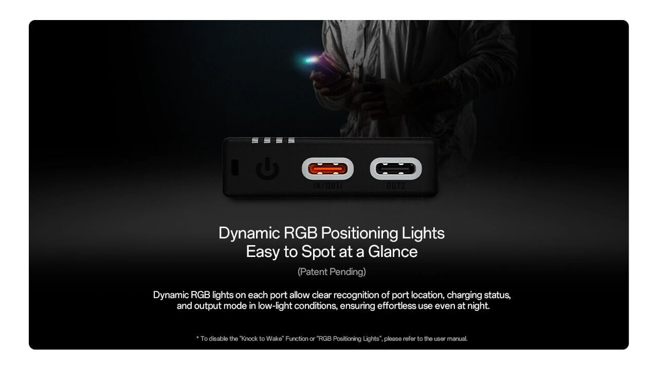 The lanyard-style USB-C cable keeps charging always within reach and also makes the power bank easy to carry or secure while moving. Illuminated USB-C ports provide clear battery and charging status indicators, while pass-through charging allows devices to charge as the power bank itself is recharging. Rounded out with RGB port lighting and a knock-to-wake function for quick power checks, Gen4 delivers intuitive, reliable power for both trail and city life.