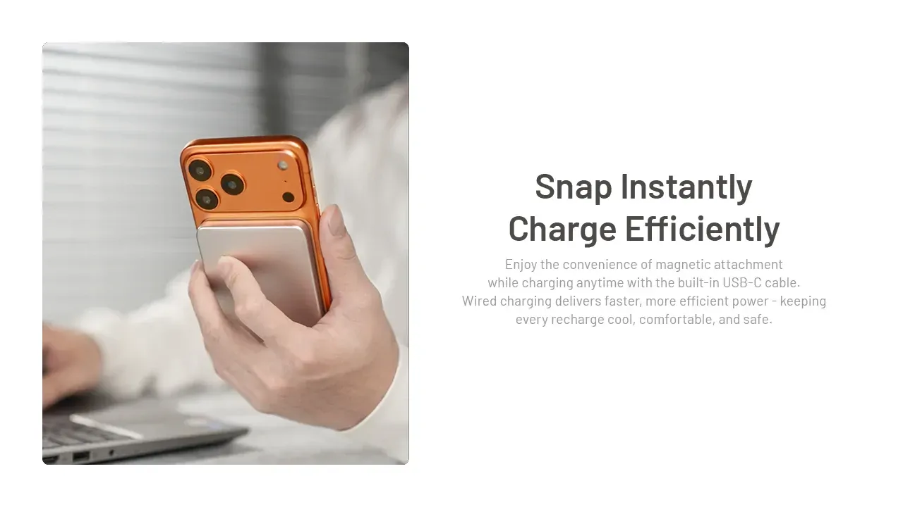 IT JUST SNAPS ON AND WORKS - Pull the integrated cable out of its storage slot, snap the power bank magnetically to the back of your phone, and plug in. That's it. One hand, one motion, and you're charging while you keep walking, texting, or navigating.