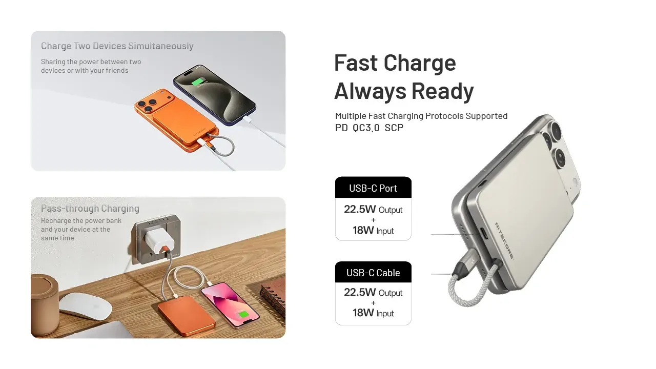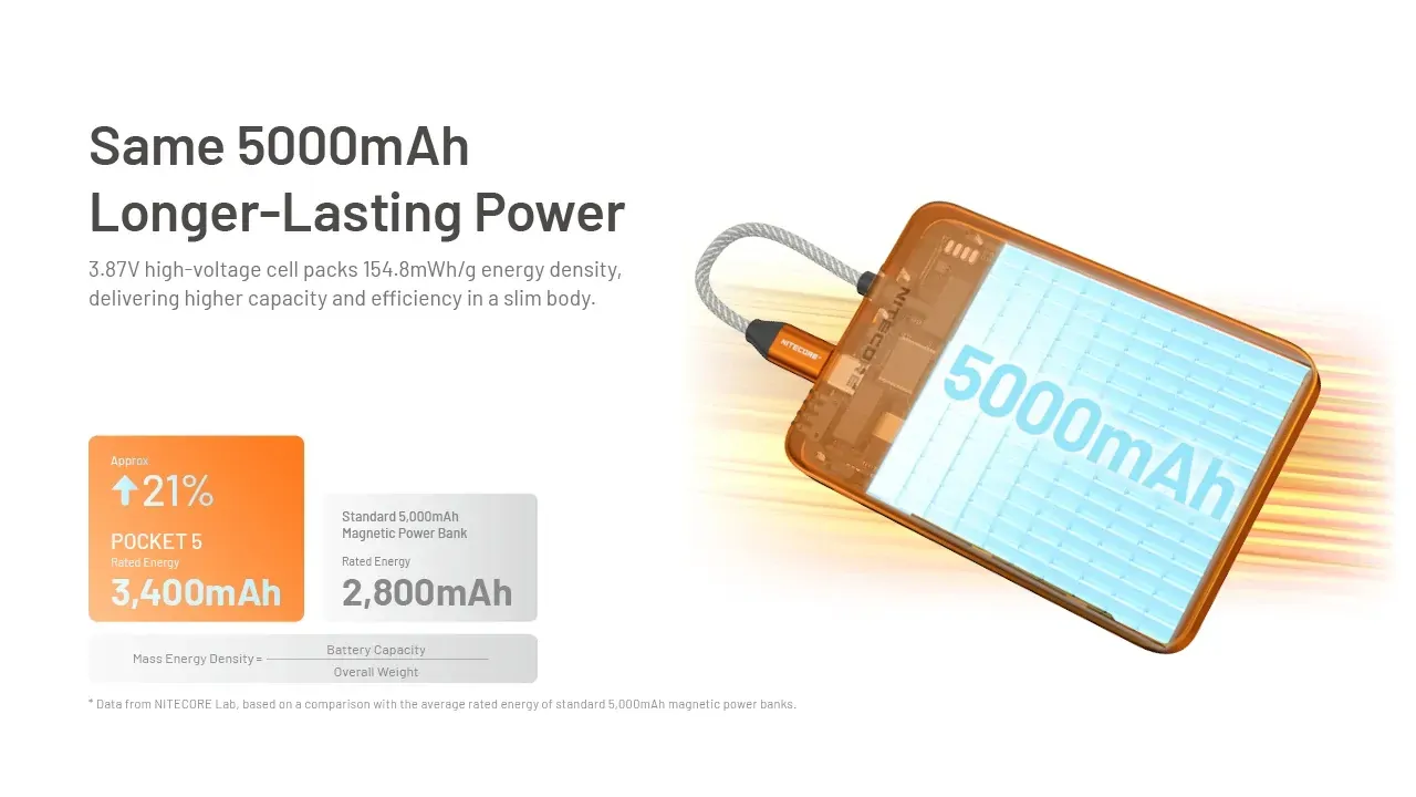 The POCKET 5 Magnetic Built-in USB-C Cable Ultra Thin Pocket Power Bank delivers a 5,000mAh capacity and up to 22.5W output. It features magnetic attachment and an integrated USB-C cable for effortless charging on the go.