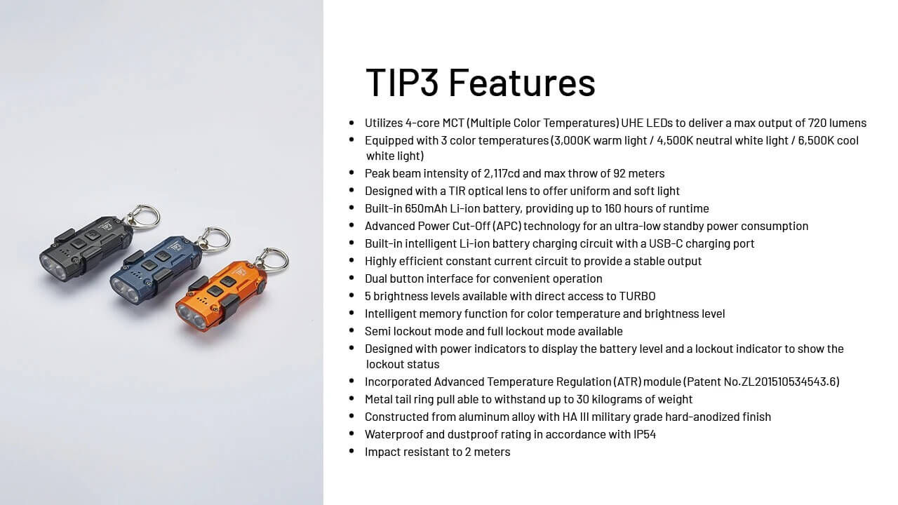 Utilizes 4-core MCT (Multiple Color Temperatures) UHE LEDs to deliver a max output of 720 lumens Equipped with 3 color temperatures (3,000K warm light / 4,500K neutral white light / 6,500K cool white light) Peak beam intensity of 2,117cd and max throw of 92 meters Designed with a TIR optical lens to offer uniform and soft light Built-in 650mAh Li-ion battery, providing up to 160 hours of runtime Advanced Power Cut-Off (APC) technology for an ultra-low standby power consumption Built-in intelligent Li-ion battery charging circuit with a USB-C charging port Highly efficient constant current circuit to provide a stable output Dual button interface for convenient operation 5 brightness levels available with direct access to TURBO Intelligent memory function for color temperature and brightness level Semi lockout mode and full lockout mode available Designed with power indicators to display the battery level and a lockout indicator to show the lockout status Incorporated Advanced Temperature Regulation (ATR) module (Patent No. ZL201510534543.6) Metal tail ring pull able to withstand up to 30 kilograms of weight Constructed from aluminum alloy with HA III military grade hard-anodized finish Waterproof and dustproof rating in accordance with IP54 Impact resistant to 2 meters
