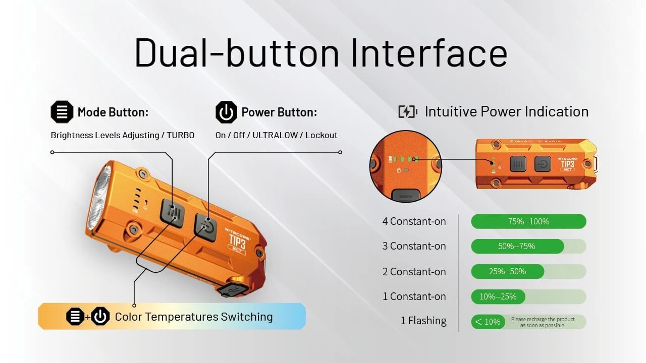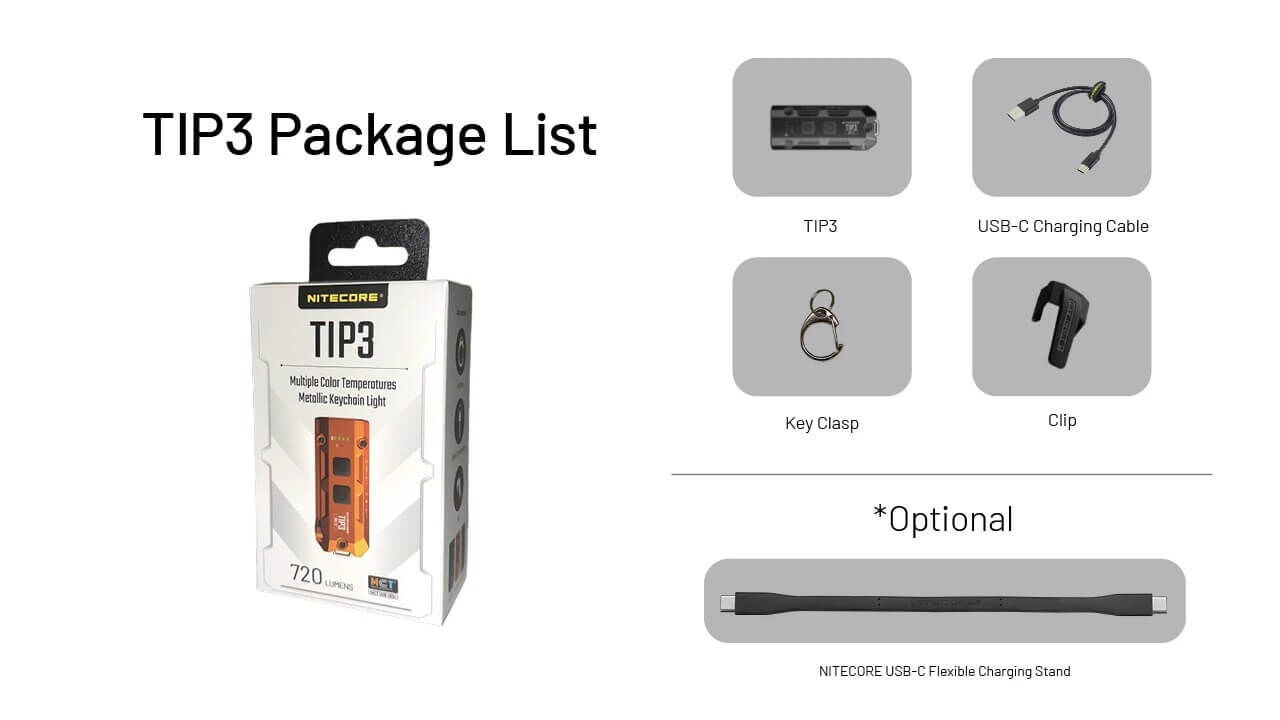 The TIP3 runs on a built-in rechargeable battery and offers up to 160 hours of runtime on its lowest setting. USB-C charging makes recharging fast and convenient, and the light can be used while charging. Lockout modes help prevent accidental activation, while clear battery indicators keep you informed. A removable clip lets you attach the TIP3 to a pocket, bag, or hat for hands-free use, in addition to keychain carry. Durable, water-resistant, and easy to use, the NITECORE TIP3 is a reliable everyday carry flashlight built for daily life.