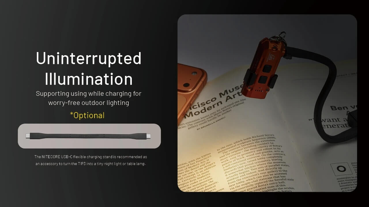 The TIP3 runs on a built-in rechargeable battery and offers up to 160 hours of runtime on its lowest setting. USB-C charging makes recharging fast and convenient, and the light can be used while charging. Lockout modes help prevent accidental activation, while clear battery indicators keep you informed. A removable clip lets you attach the TIP3 to a pocket, bag, or hat for hands-free use, in addition to keychain carry. Durable, water-resistant, and easy to use, the NITECORE TIP3 is a reliable everyday carry flashlight built for daily life.